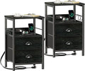 Furologee Nightstand Set of 2, Rustic Brown, with Charging Station and USB Ports, Side Tables with 2 Fabric Drawers, Bedside Tables with Storage Shelf & Hooks, for Living Room/Bedroom