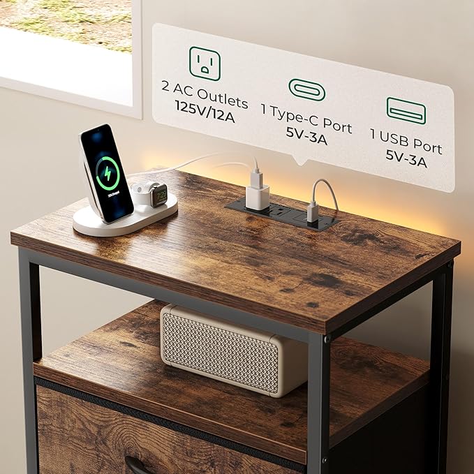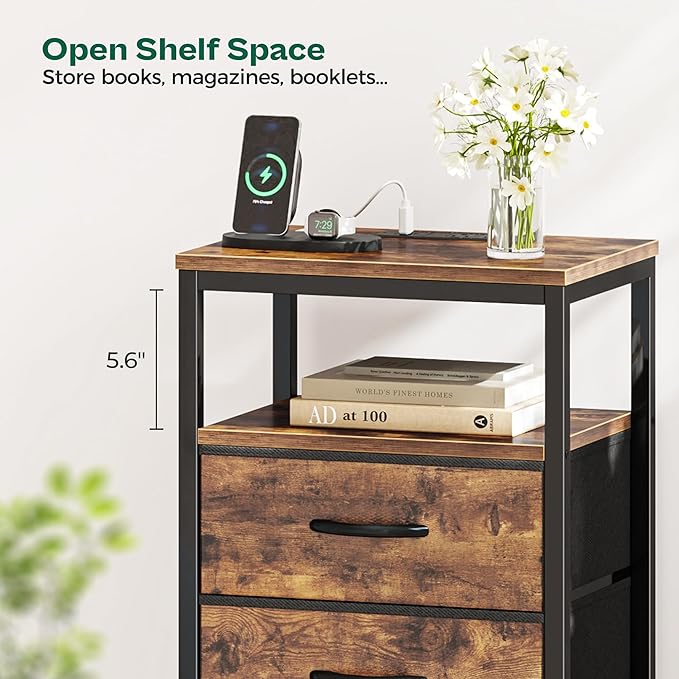 Huuger Night Stand with Charging Station, 4 Drawer Dresser for Bedroom, Bedside Table, 33.9 Inch Tall Nightstand with Open Shelf, End Table, for Closet, Entryway, Bedroom, Rustic Brown