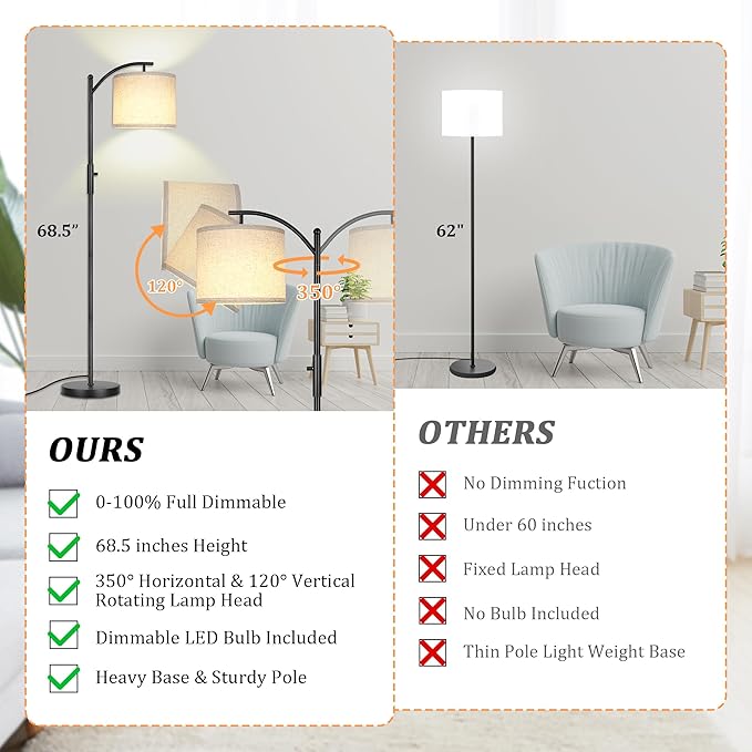 ROTTOGOON Dimmable Floor Lamp, Arc Floor Lamps for Living Room, Stepless Dimming Modern Standing Lamp with Linen Shade, Tall Lamp for Bedroom Office Dining Room- Black