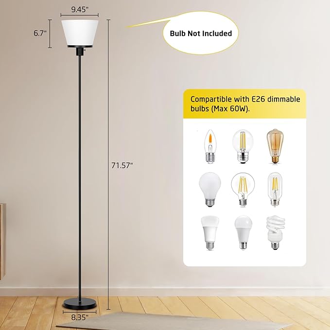 LED Floor Lamp Tall Standing Lamp, Black Modern Torchiere Floor Lamps for Bedroom Living Room Office, Bright Floor Lamp with White Plastic Shade, Bulb Not Included.