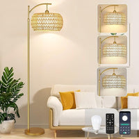 Gold Floor Lamp for Living Room with 3 Color Temperatures,Arc Boho Floor Lamps with Remote Control, Rattan Standing Lamp with Wicker Lamp Shades Dimmable Tall Floor Lamp For Bedroom Living Room Corner