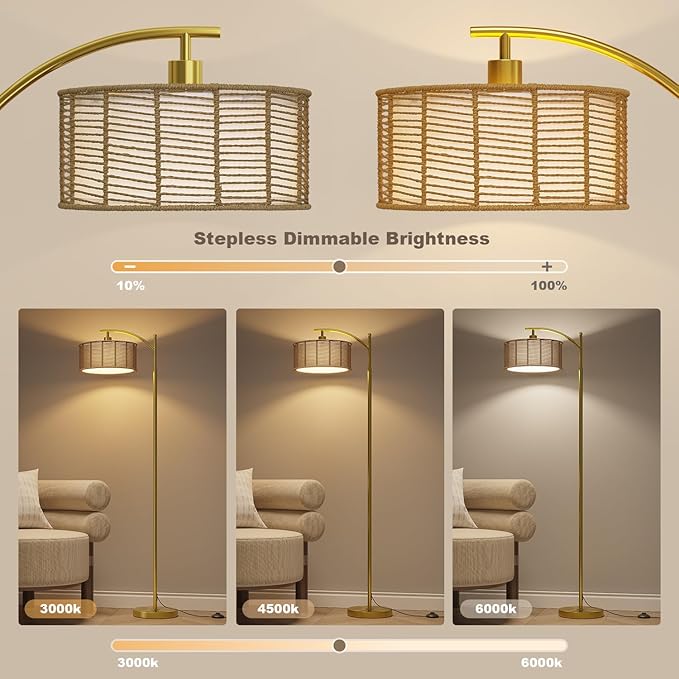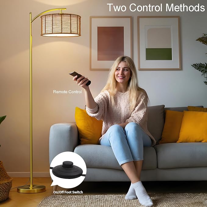 Oneach 62.5" Gold Arc Floor Lamp for Living Room, Rattan Boho Floor Lamp with Remote and Dimmable Bulb, 3 Color Temperatures, Farmhouse Rustic Modern Standing Lamp for Bedroom Office Corner