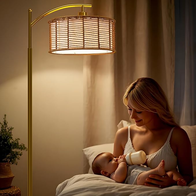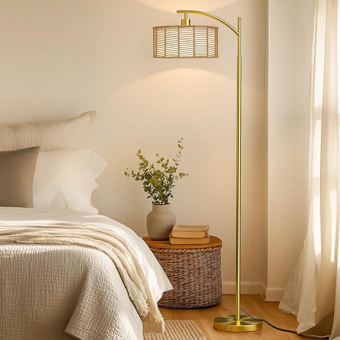 Oneach 62.5" Arc Floor Lamp for Living Room, Rattan Boho Floor Lamp with Gold Metal Base, Double Shades, Farmhouse Rustic Modern Standing Lamp for Bedroom Office Corner