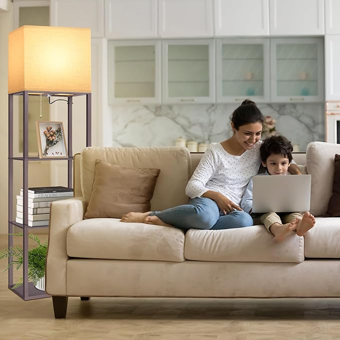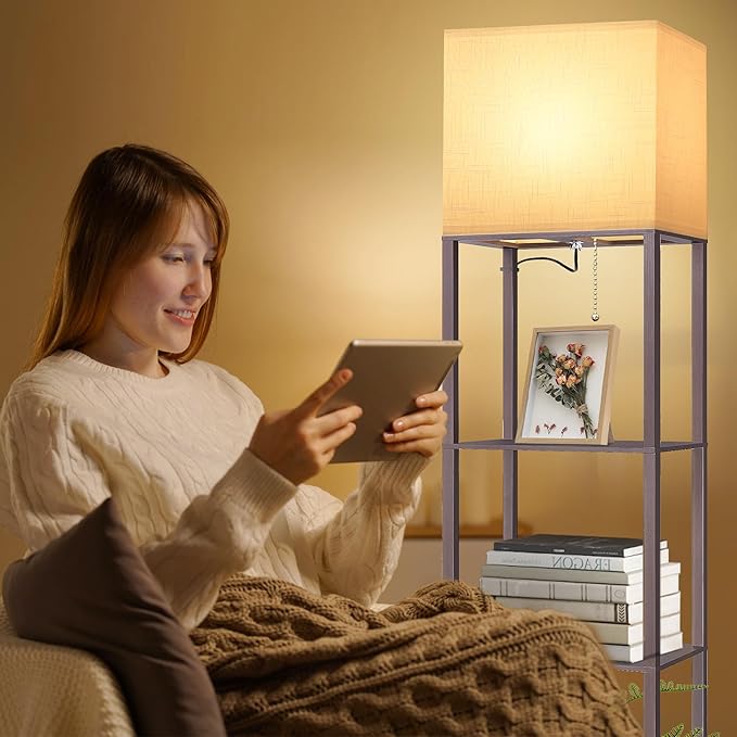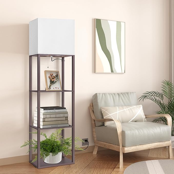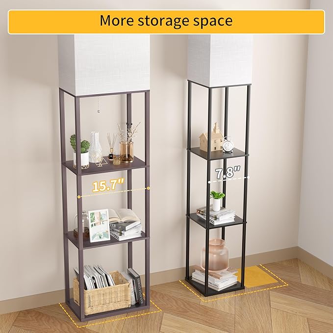 Dott Arts Floor Lamp with Shelves, Wide Floor Lamps for Living Room Display Shelf Lamps with 3 Color LED Bulb,Storage Wood Modern Floor Lamp for Bedroom Standing Lamp for Living Room Office(Walnut)