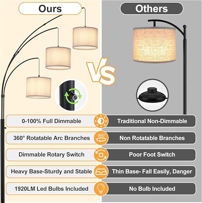 DLLT Modern Floor Lamp for Room: 3-Light Black Tree Dimmable Floor Lamps with Gray Shades for Living Room - Arc Standing Lamp for Bedroom - Tall Floor Lamp for Office Corner 3 LED Bulbs Included