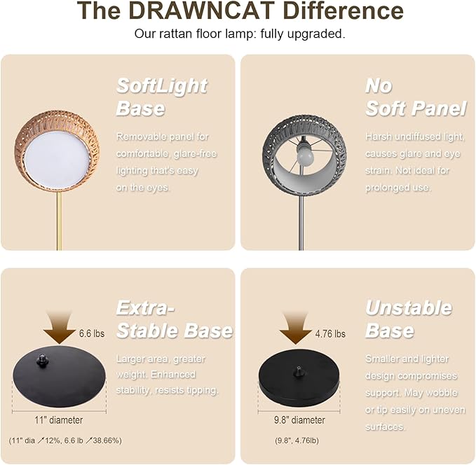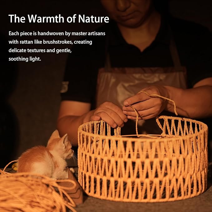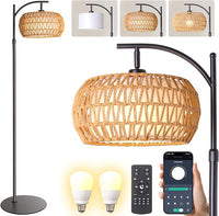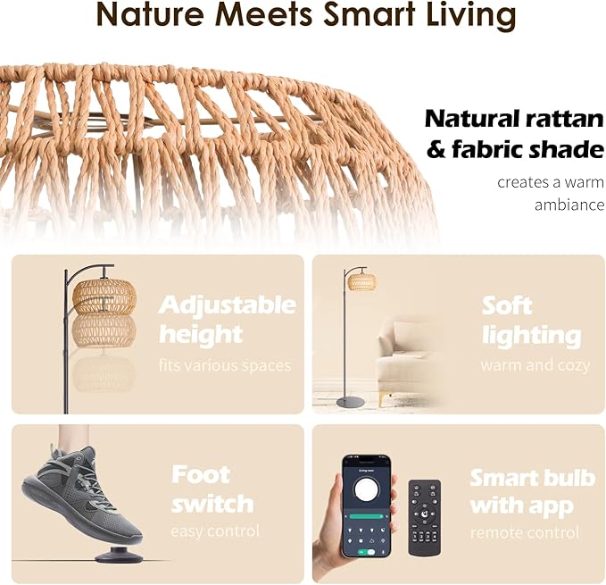 Boho Rattan Floor Lamp with Shade - 12W Bright LED Bulb, Adjustable Height 48-60 Inch, Remote Control 3 Color Temperatures, Handwoven Arc Standing Light for Living Room