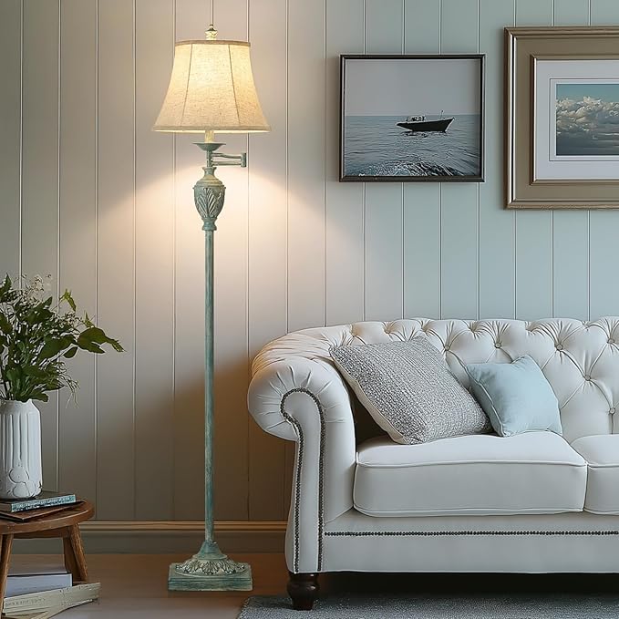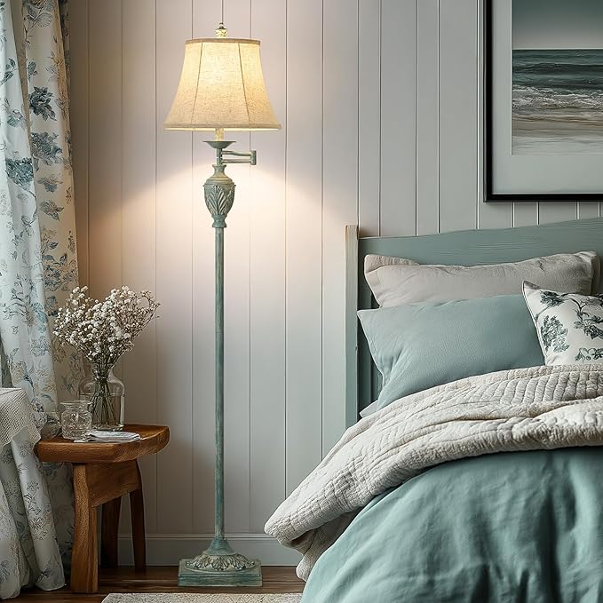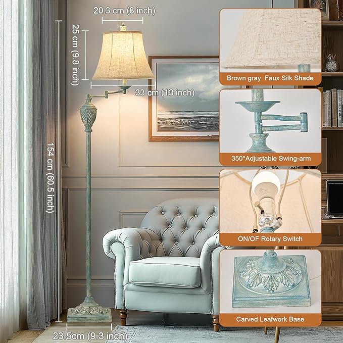Traditional LED Floor Lamp with 350° Adjustable Swing Arm Lamp – Vintage Standing Pole lamp for Living Room, Bedroom and Office – Rustic Upright Floor Light for Home Décor with Faux Silk Fabric Shade