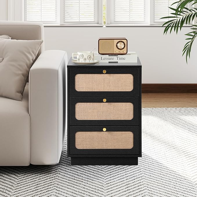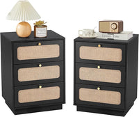 Nightstand with 3 Drawers Set of 2, Mid Century Modern Night Stand with Linen Drawers & Stable Legs, Wood Rustic Bedside Table End Table Side Table for Bedroom, Black