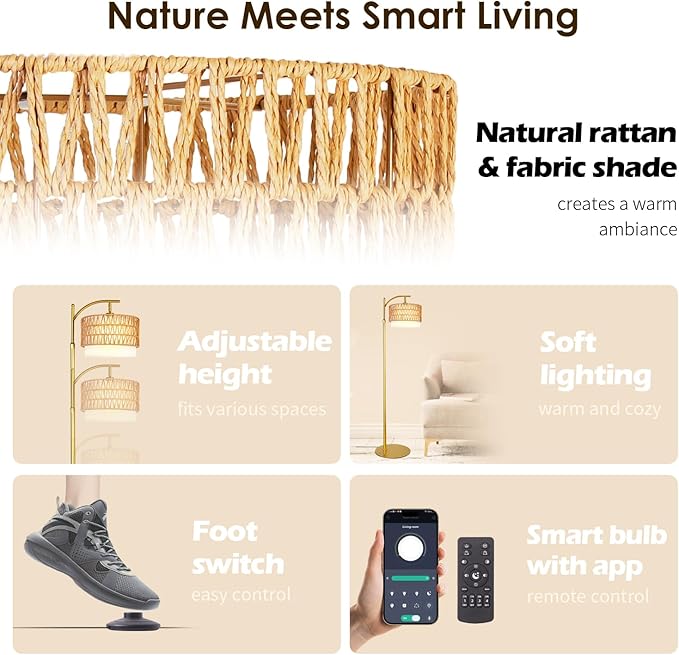 Bohemian Rattan Floor Lamp for Living Room - Golden Arc Design, 12W LED (1 in use + 1 Spare), Remote & Dimmable 3 - Color Temp, Tall Standing Lamp