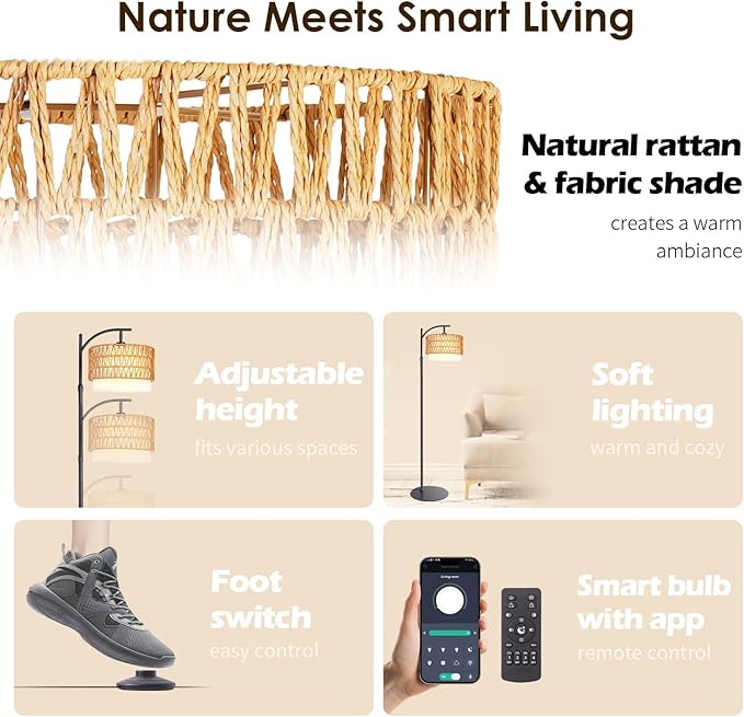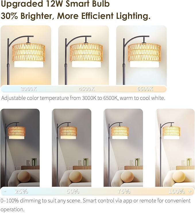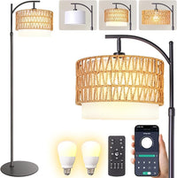 Bohemian Rattan Floor Lamp for Living Room - Black Arc Design, 12W LED (1 in use + 1 Spare), Remote & Dimmable 3 - Color Temp, Tall Standing Lamp