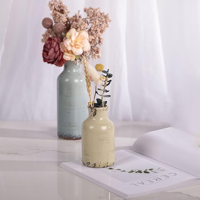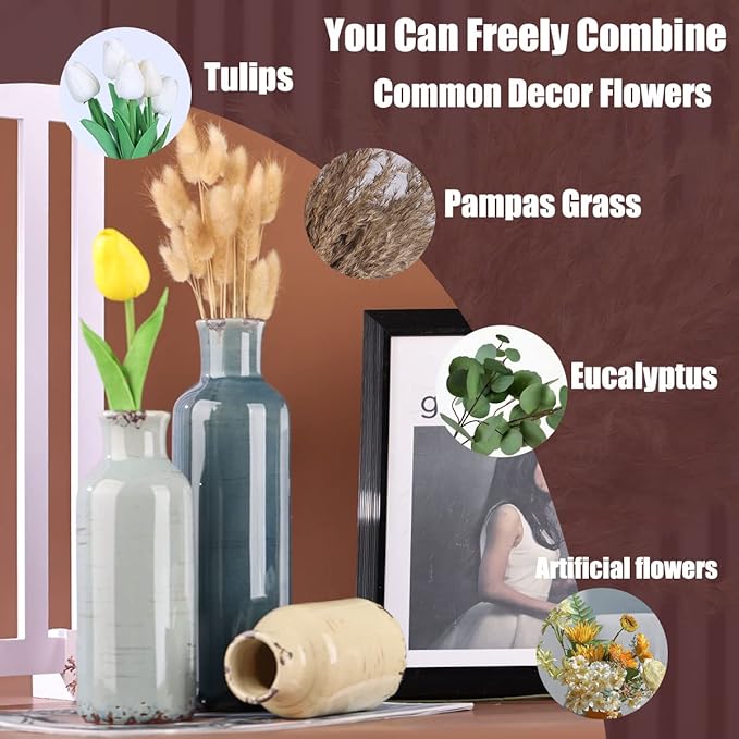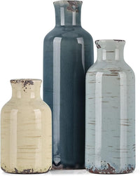 Multicolor Ceramic Vase Set of 3 - Coastal Rustic Farmhouse Decor Flower Vases for Shelf, Dining Room Table, Fireplace Mantel, Living Room, Coffee Table, Tabletop, Kitchen Cabinet, Entryway Decoration