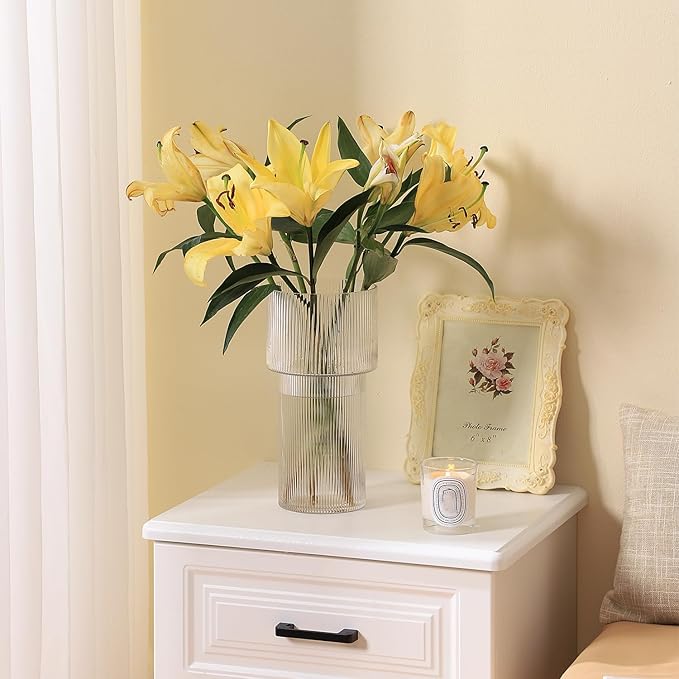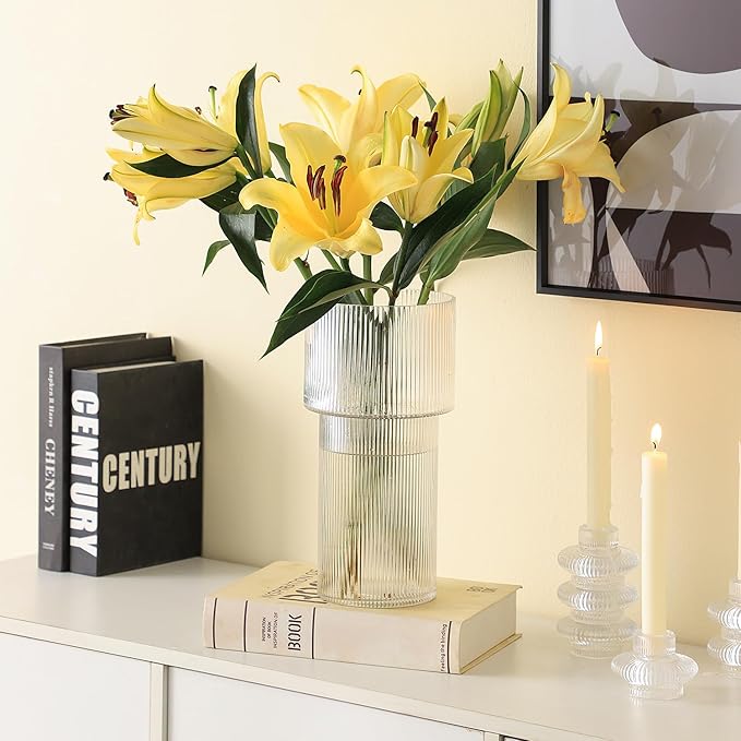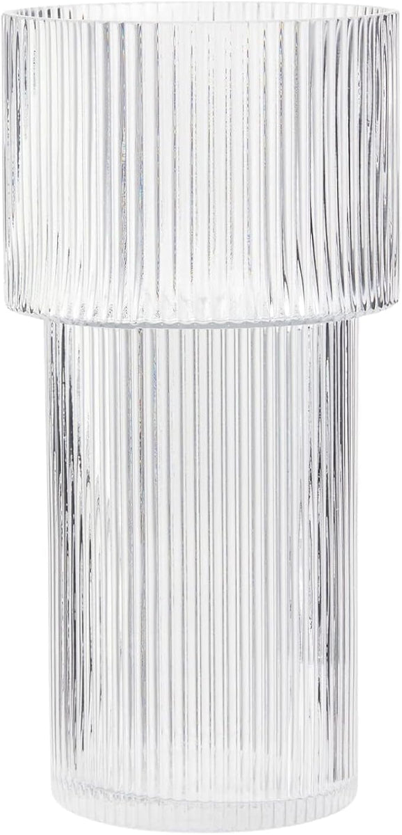 Large Glass Vase, 12 Inches Tall Vase for Flowers, Flower Vases for Bouquet, Modern Ribbed Glass Vases for Living Room, Dining Table, Office, Entryway, Mantle, Shelf, Wedding Gifts