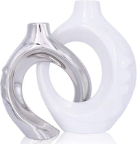 White Ceramic Vase Set of 2, White and Silver Round Donut Ceramic Decorative Vase for Living Room Decor, Bookshelf, Mantel, Dining Table Centerpiece Decor (White Silver)