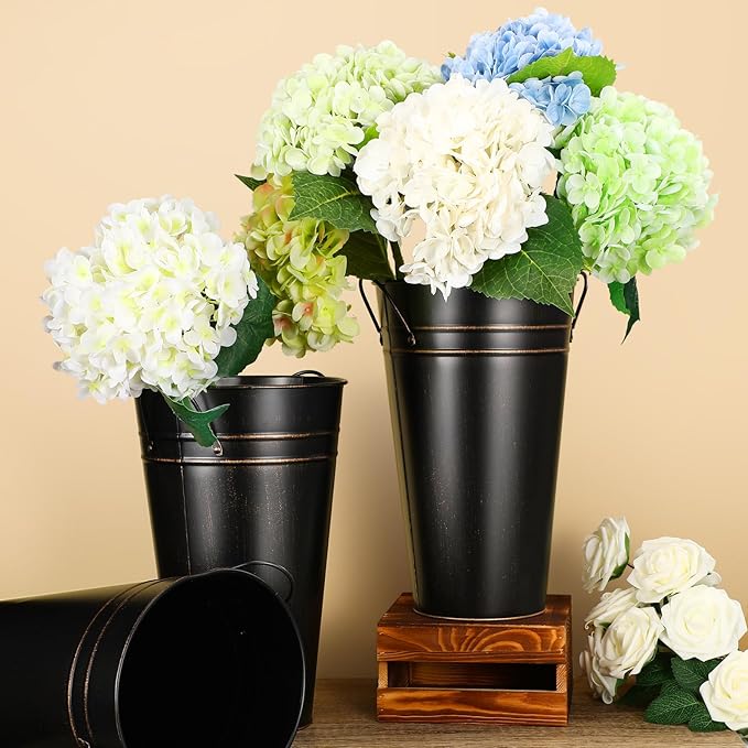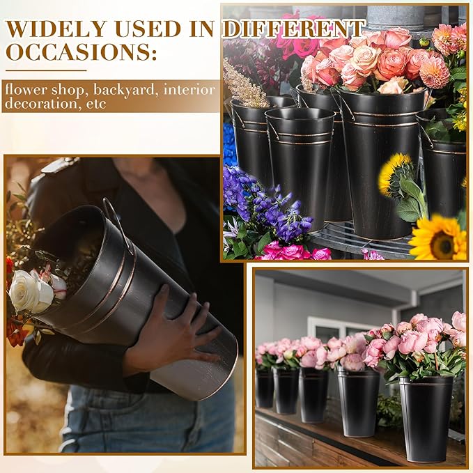 Irenare 12 Inch Vintage Galvanized Flower Bucket Metal Flower Vase Farmhouse French Bucket Planter Metal Floral Container for Party Table Centerpiece Weddings Home(Black,6 Pcs)