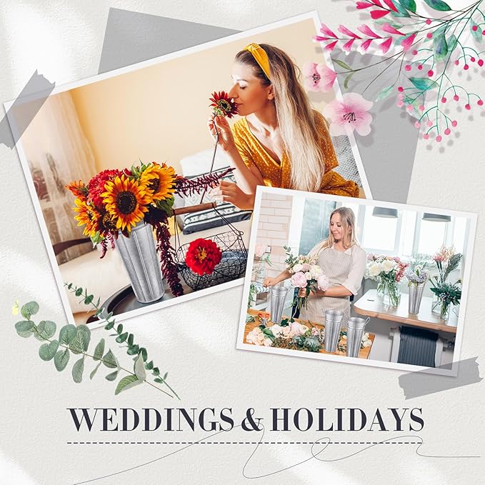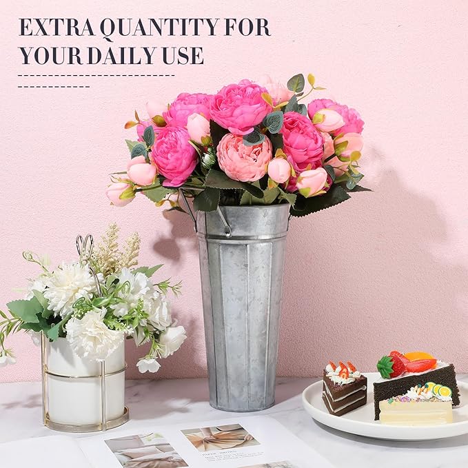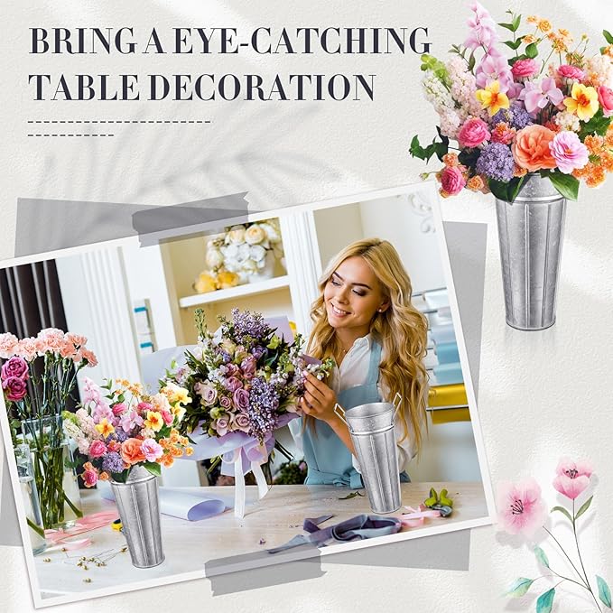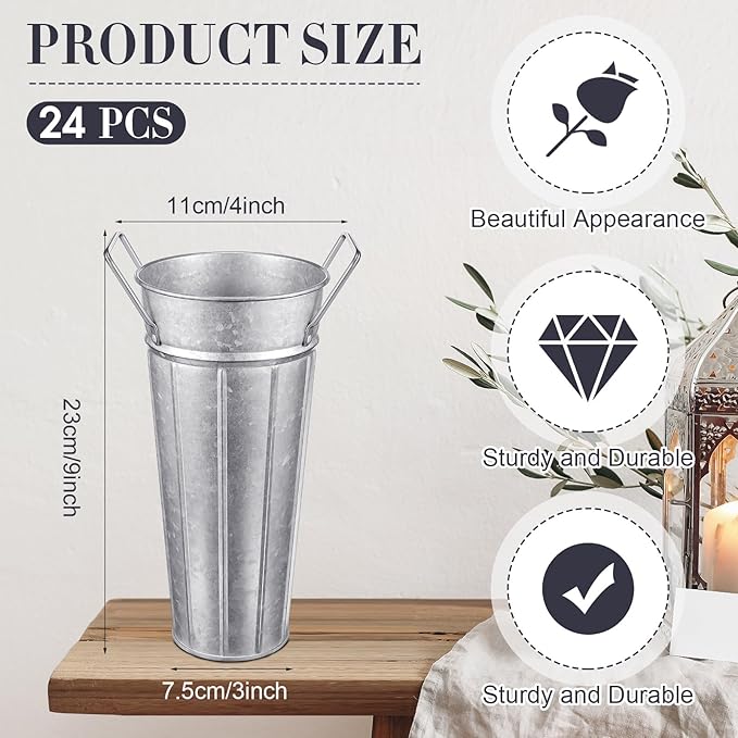 Lallisa 24 Pcs Metal Vases 9 Inch Galvanized French Farmhouse Flower Buckets with Handles and Hemp Rope, Vintage Style Flower Containers for Country Wedding Party Table Centerpiece Decor(Silver)