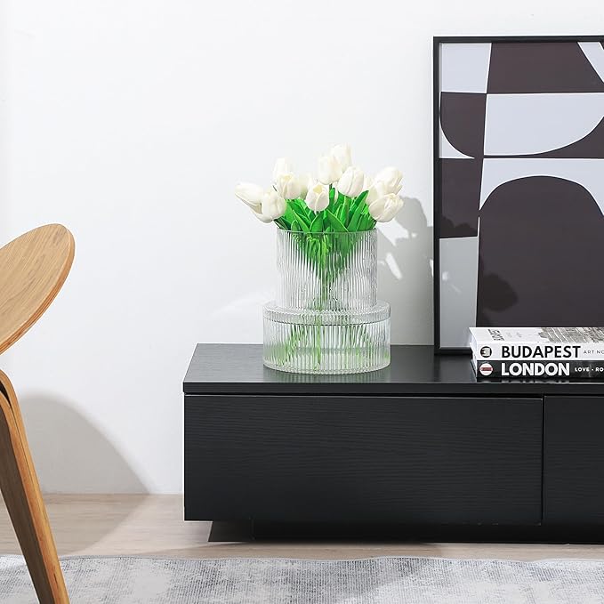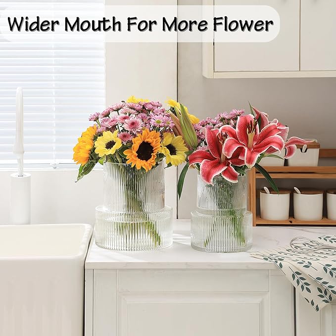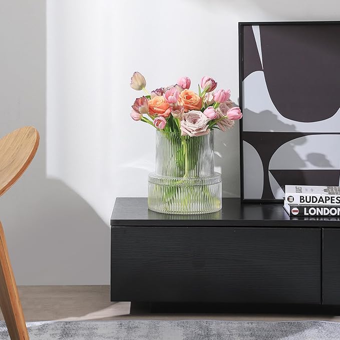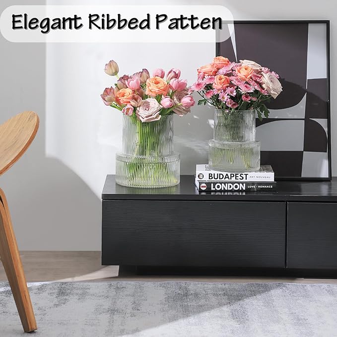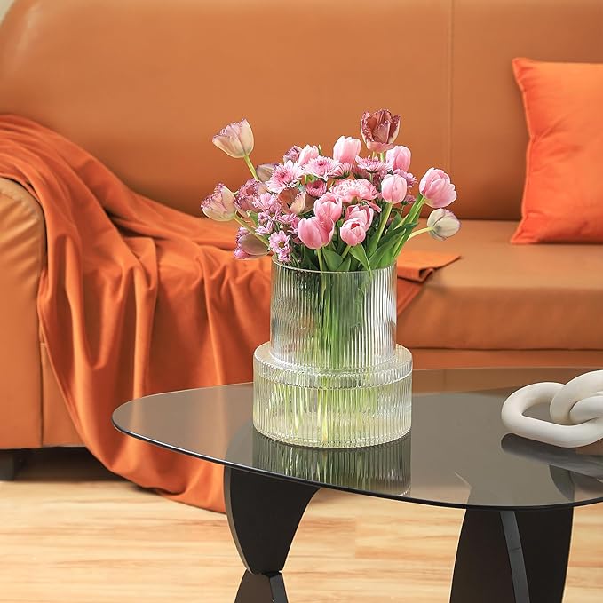 Ribbed Glass Vase, Large Glass Vase for Flowers, Fluted Glass Vases, Clear Glass Vases for Living Room, Office, Dining Table, Entryway, Mantle, Shelf, Wedding, 9 Inches