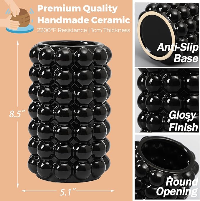Black Bubble Vase, Ceramic Vase, Flower Vase, Boho Vase, Tall Ceramic Vase, Vase for Decor, Modern Ceramic Vase for Living Room, Dinner Table, Bedroom, Wedding, Fireplace Mantel, 8.5 Inches