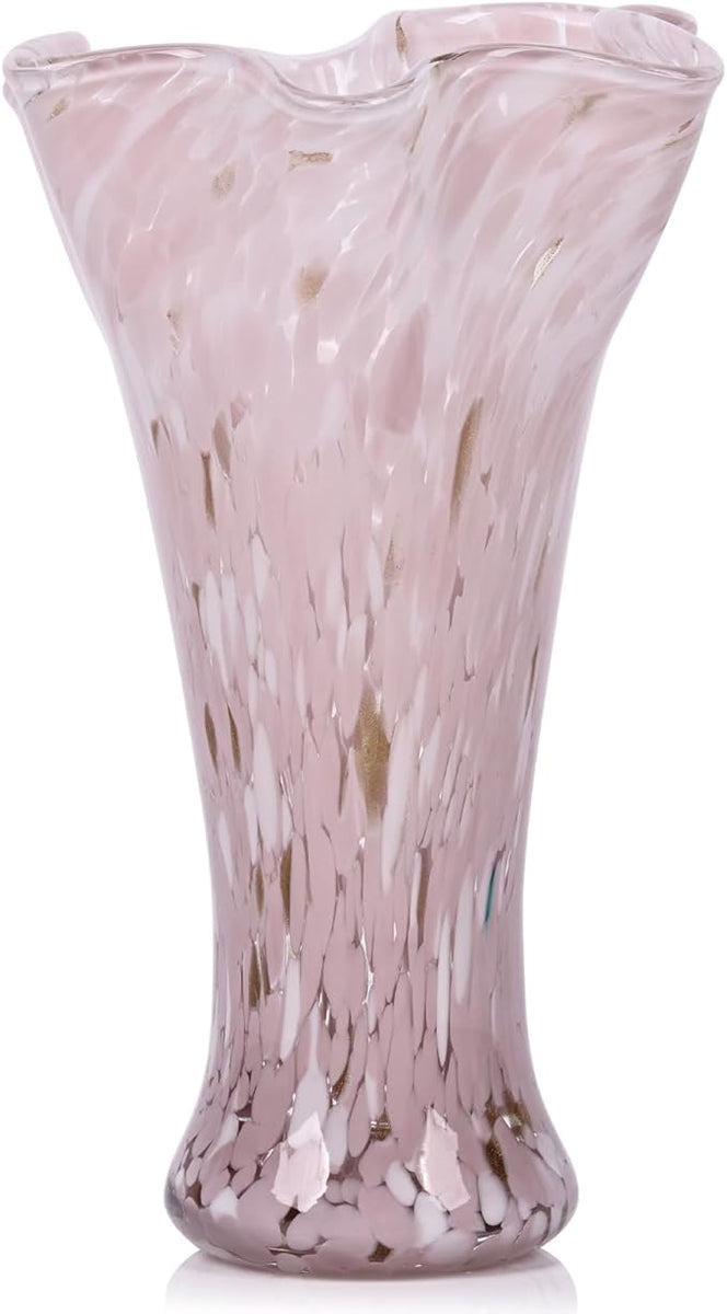 9.0" H Pink Glass Vases for Flowers, Unique Hand Blown Glass Vase Pink Home Decor, Wide Mouth Colorful Flower Vase Centerpieces, for Living Room Table Bookshelf, Bathroom Office Shelf Decorative
