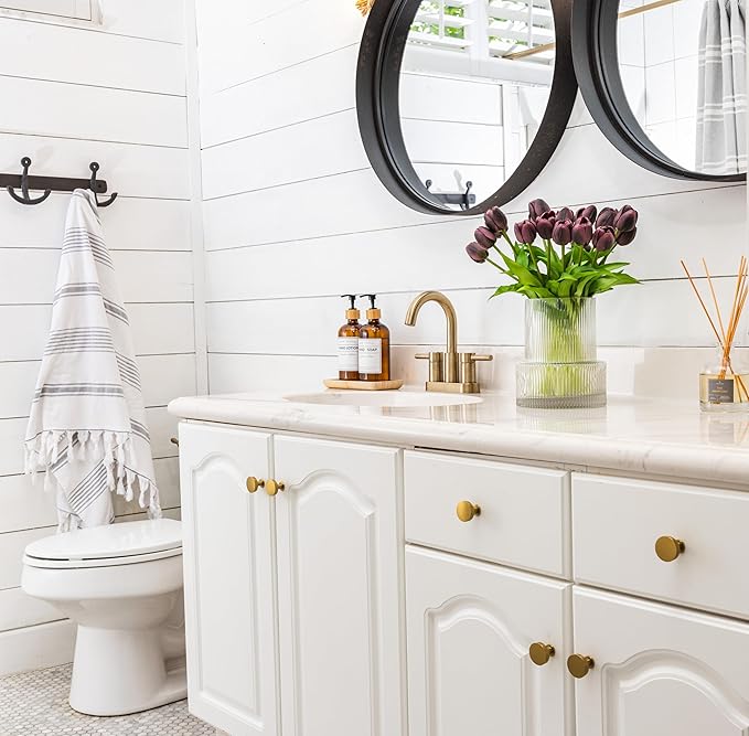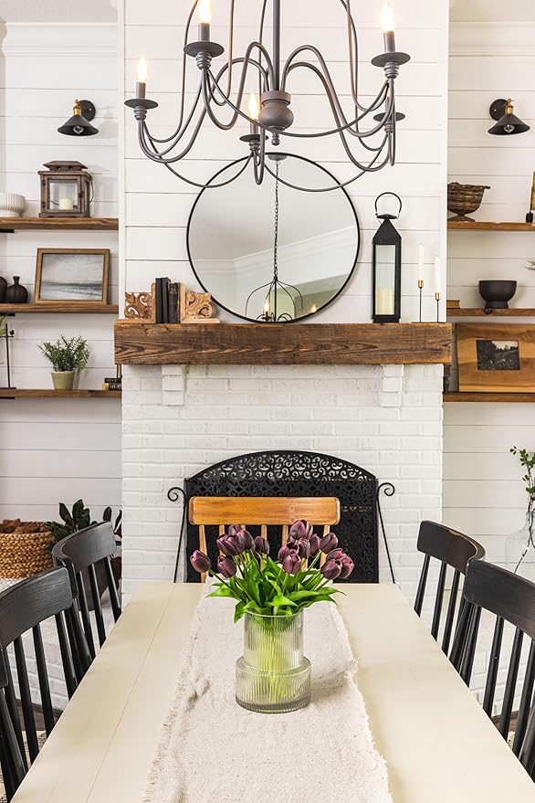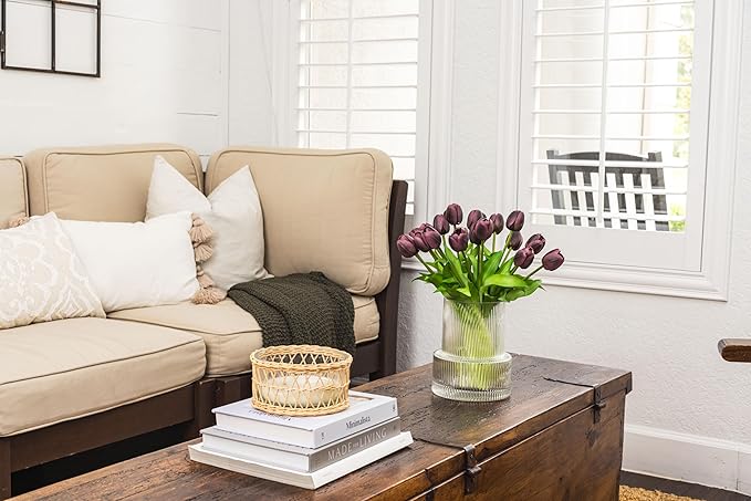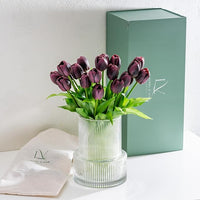 Purple Tulips with Vase Ribbed Glass Vase with 20 Realistic Artificial Flowers Gift Set. Fluted Clear Flower Vase and Fake Tulips Entryway Living Room Table Office Shelf Decor Faux Spring Decor