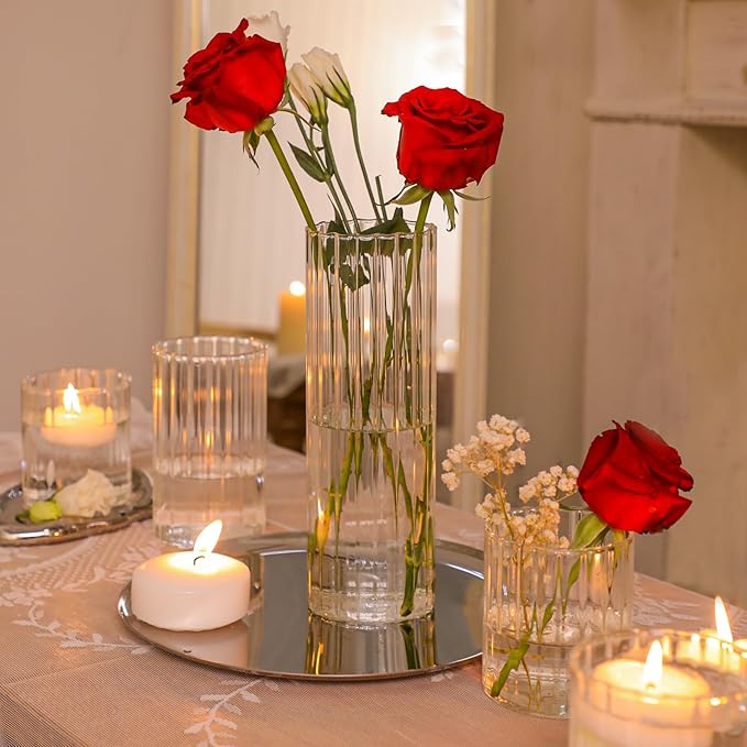 ComSaf Glass Cylinder Vases Pack of 12, Clear Ribbed Bud Vases for Centerpieces Weeding Decoration, 4 inch 6 Inch 10 Inch Tall Clear Flower Vases in Bulk, Hurricane Candle Holder for Party Home Decor