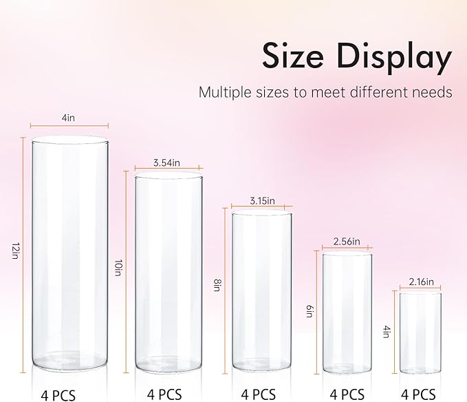 20 Pack Clear Glass Vases for Centerpieces, Cylinder Vase Set, 4,6,8,10,12 Inch Tall Flower Vase for Home Decor, Flower Vase for Table Decorative & Hurricane Floating Candle Holders