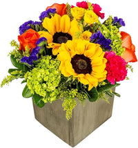 Hugs & Kisses in Wooden Vase | Yellow, Orange Aquabloom Arrangement | Arabella Bouquets | Real Fresh Flowers for Delivery, Gift for Birthday, Congratulations, Anniversary, Monther's Day