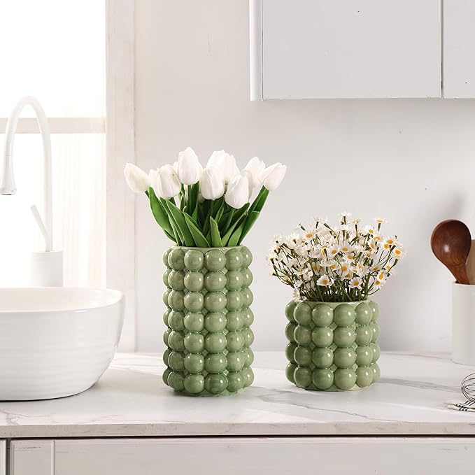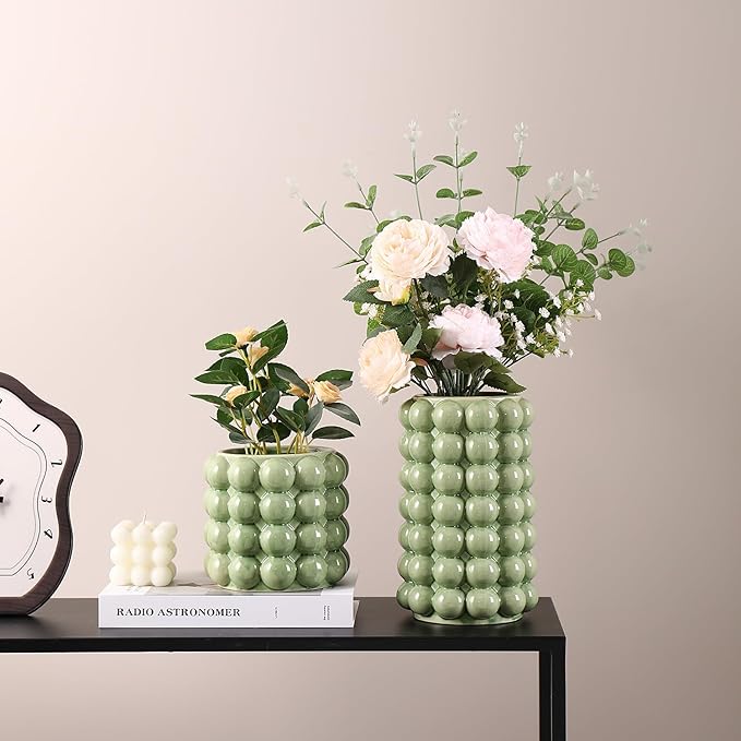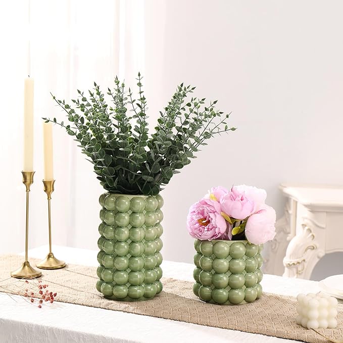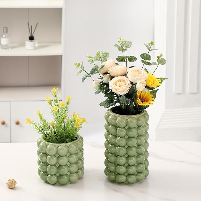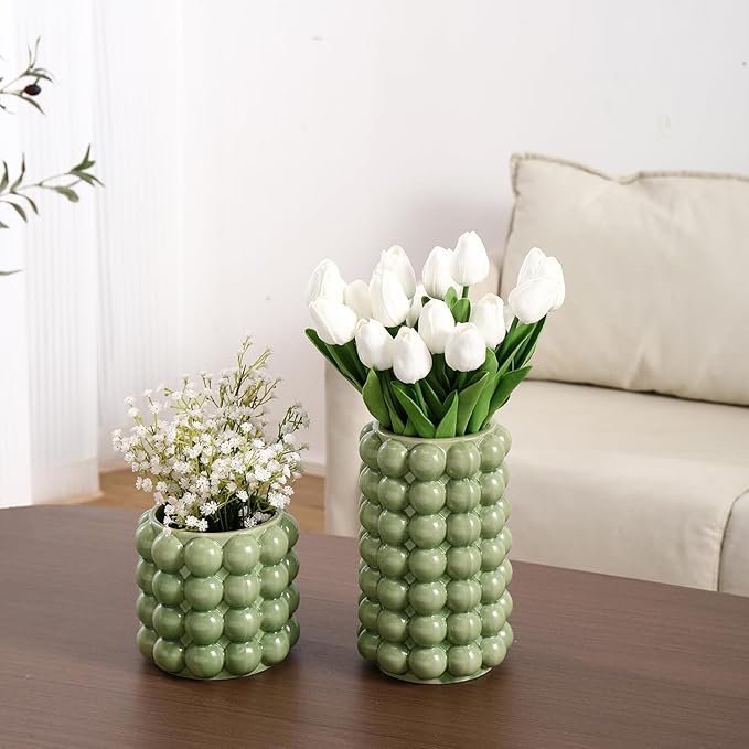 Bubble Vases, Set of 2 Green Ceramic Vases, Short Vases, Ceramic Flower Vases, Unique Vases, Tall Bubble Vases for Coffe Table Decor, Decorative Vases for Living Room, Dining Table, Wedding