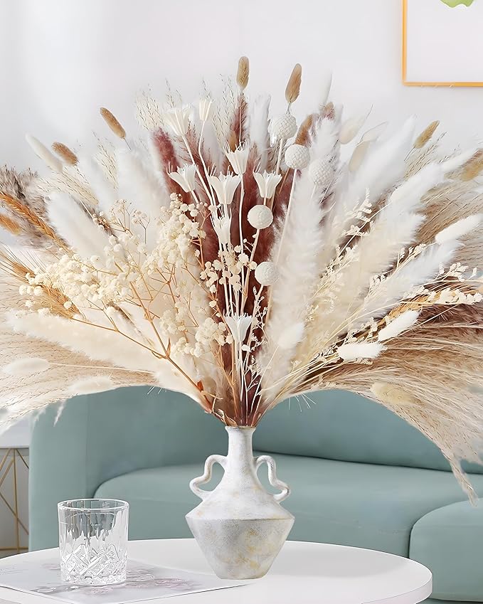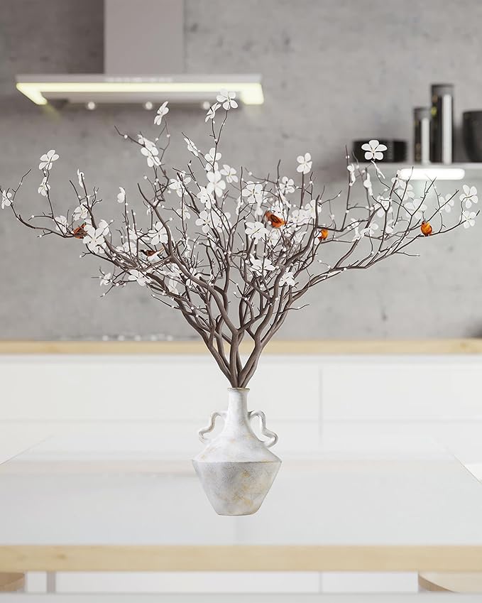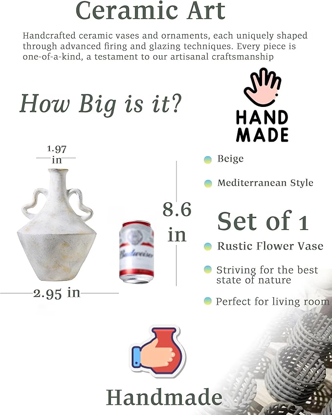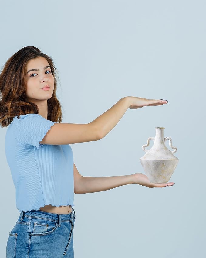 8.6 in Rustic Ceramic Farmhouse Vase with 2 Handles,Glazed Beige and Yellow Vintage Pottery Jar with Black Distressed Eroded Texture Finish,Boho for Home Decor,Tabletop,Mantel,or Living Room