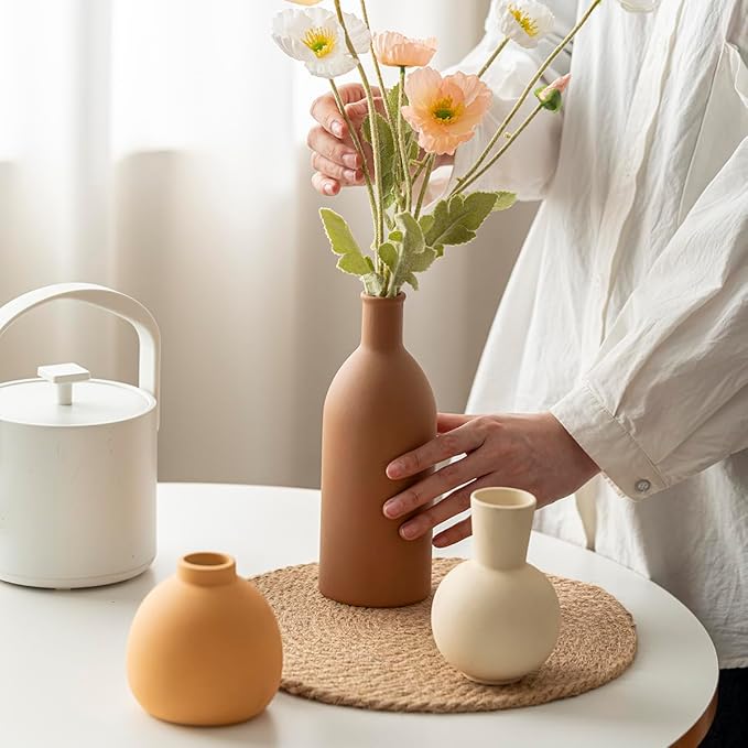 Modern Ceramic Vase Set of 3, Decorative Flower Vases for Home, Multicolor Pottery Vases for Living Room, Kitchen, Bedroom, Shelf, Rustic Farmhouse (Brown Mix)