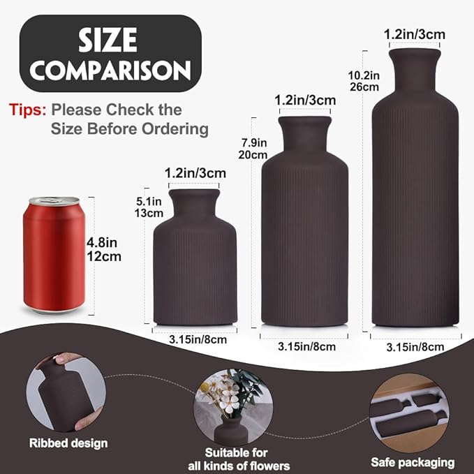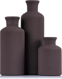 Brown Ceramic Vases Set - 3 Brown Small Vase, Farmhouse Country Vases Home Decor, Living Room Decoration, Table Decoration, Fireplace Decor, and Entrance Decorations Centerpieces
