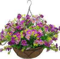 Artificial Hanging Flowers with Basket,Fake Daisy Flowers in 12 inch Coconut Lining Hanging Baskets for The Decoration of Courtyard, Indoors, and Outdoors(Violet)