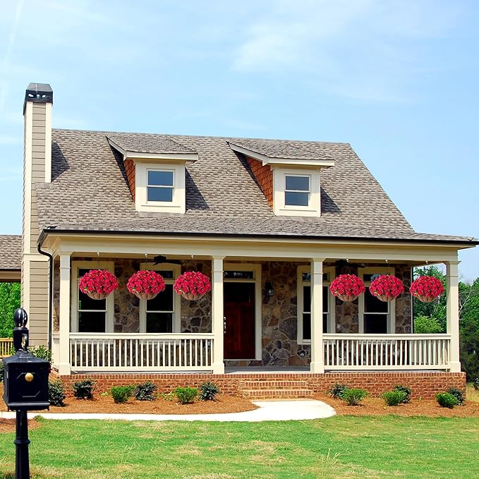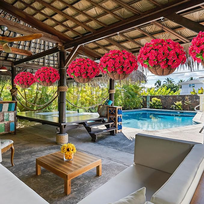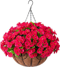 Artificial Hanging Flower Plants with Basket for Outdoor Decoration, Faux Petunias Flowers Fake Morning Glory Planter for Outside Patio Garden Porch Balcony Yard Decor(Rose Red)