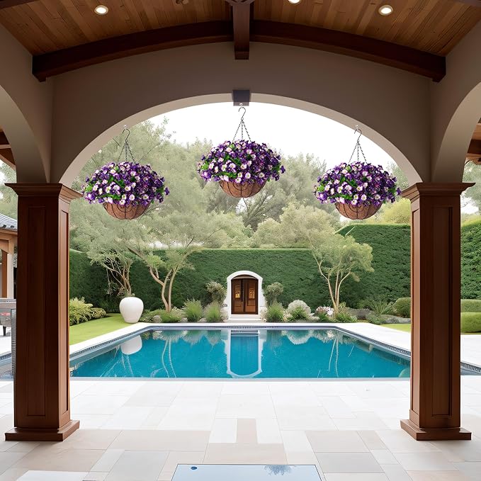 Artificial Hanging Flowers 12 inch Basket, Faux Silk Petunias Flower Arrangement,Coconut Lining Pot Planter with Morning Glories Patio Garden Porch Deck Spring Summer Decor(Purple Edge)
