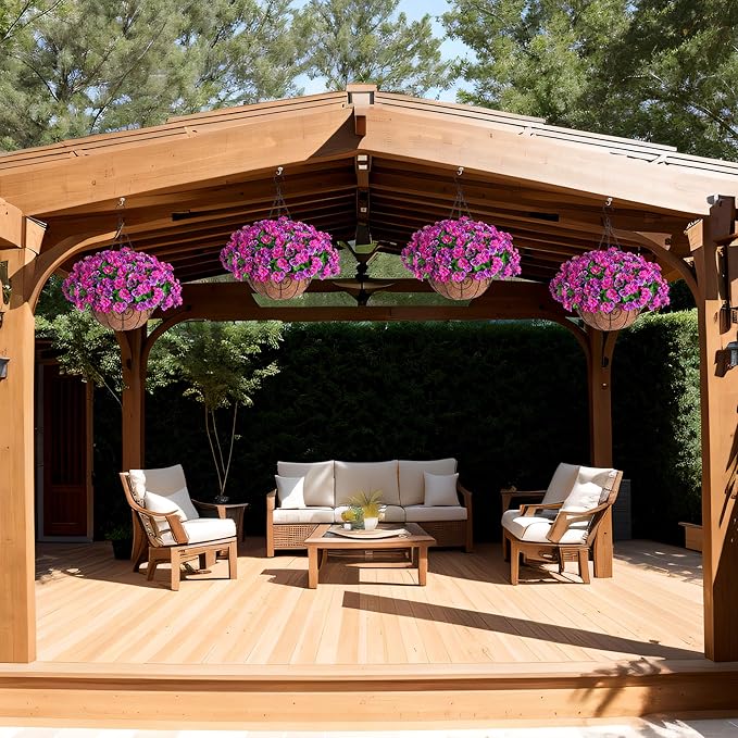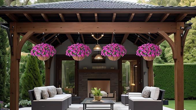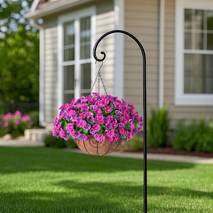 Artificial Hanging Flowers with Basket, Faux Silk Petunias Flower Arrangement, Coconut Lining with Morning Glories Fake Plants Patio Garden Porch Deck Spring Summer Decor(Lotus and Fuchsia)