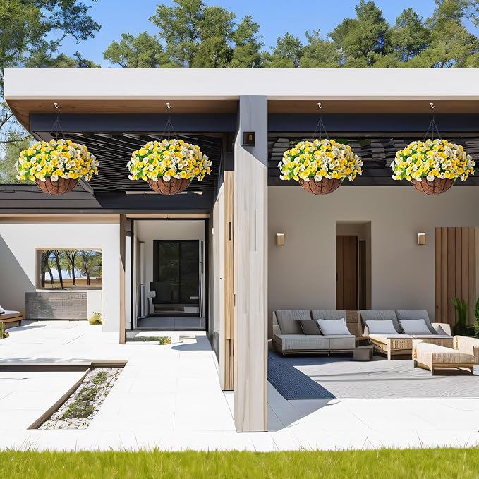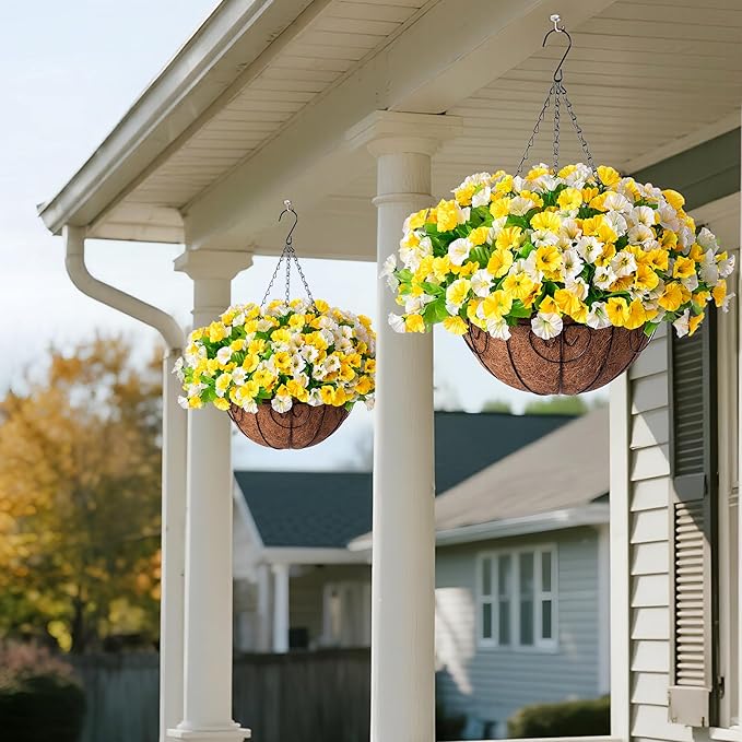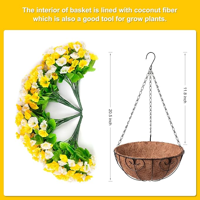 Artificial Hanging Flowers with Basket, Faux Silk Petunias Flower Arrangement, Coconut Lining with Morning Glories Fake Plants Patio Garden Porch Deck Fall Decor(Yellow and White)