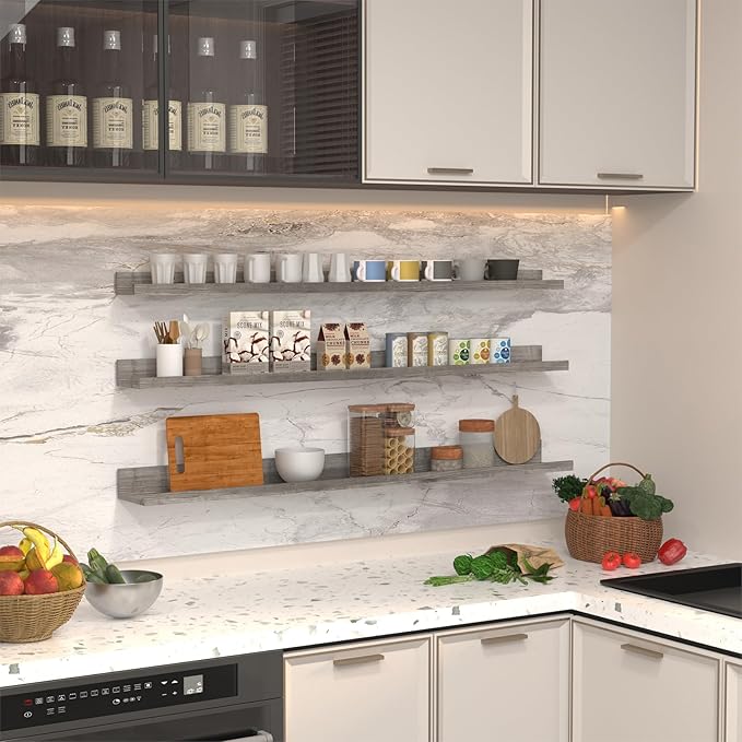Giftgarden 47 Inch Gray Floating Shelves for Wall Mount, Grey Wood Wall Shelf Ledge for Bathroom Bedroom Living Room Kitchen Storage, Set of 3 Different Sizes
