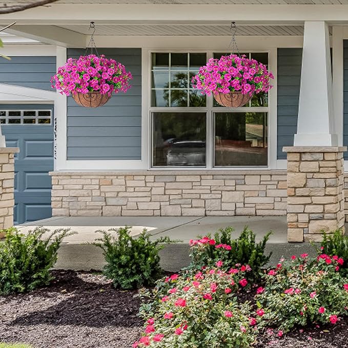 Artificial Fake Hanging Flowers Plants in Basket for Outdoor Decoration, 12 Pcs Faux Morning Glory in Planter Realistic UV Resistant Silk Flowers for Home Porch Patio Balcony Yard Outside, Fuchsia