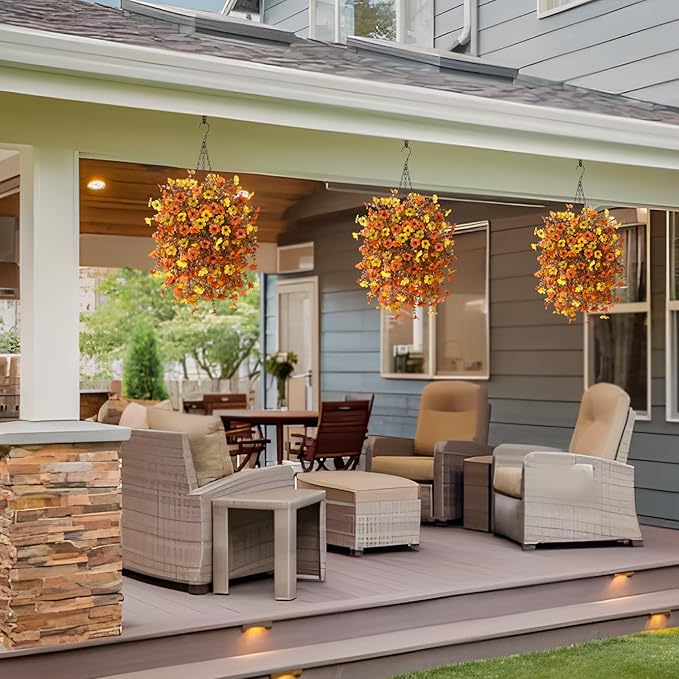 Artificial Fsll Faux Hanging Flowers Plants Basket for Outdoor Decoration,Fake Silk Orange Mums planters UV Resistant Look Real for Home Porch Patio Yard Outside Autumn Decor (Yellow Orange)