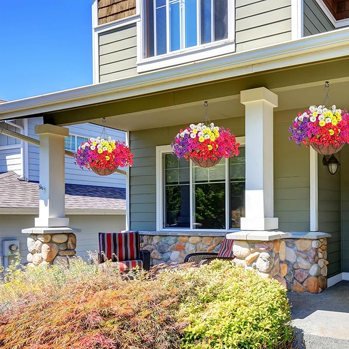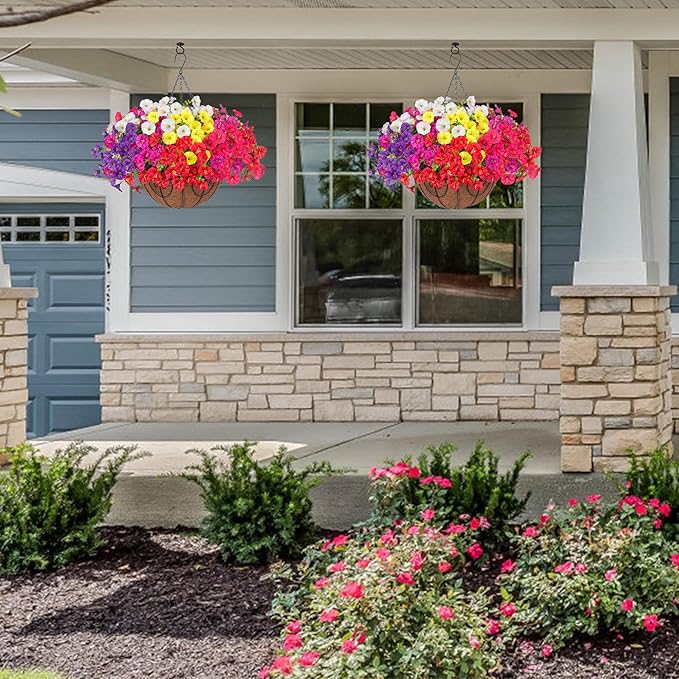 Artificial Faux Hanging Flowers Plants Basket for Outdoors, Silk Morning Glory with Eucalyptus in Planter Look Real UV Resistant Fake Flowers for Porch Outside Patio Balcony Yard Indoor Summer Decor Sale