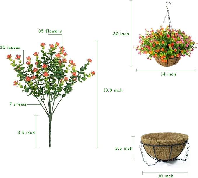 Artificial Hanging Flowers Basket, 12 UV-Resistant Bundles of Realistic Fake Flowers, Faux Plants for Outdoor Decor, Home, Garden, Porch, Patio, Spring & Summer Decorations, Orange Pink Red