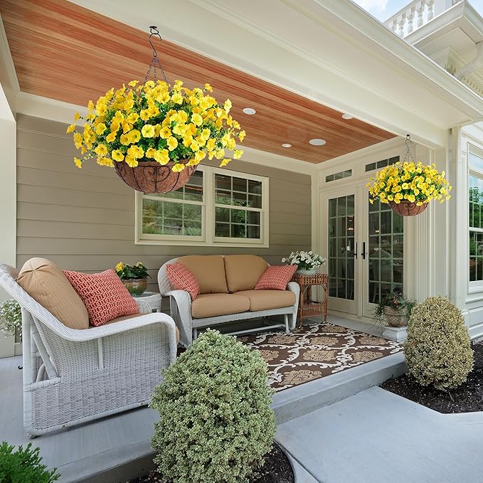 Artificial Fake Hanging Flowers Plants Baskets for Outdoor Decoration, Faux Silk Morning Glory in Planter UV Resistant Realistic for Home Outside Porch Patio Balcony Garden Yard Home Decor, Yellow Sale
