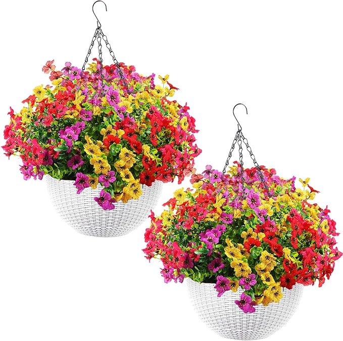 Lyrow 2 Pcs Artificial Hanging Flowers with Fake Basket Outdoor Realistic Hanging Plants with 12 Inch Coconut Lining Basket for Patio Lawn Garden Porch Decor(Bright)