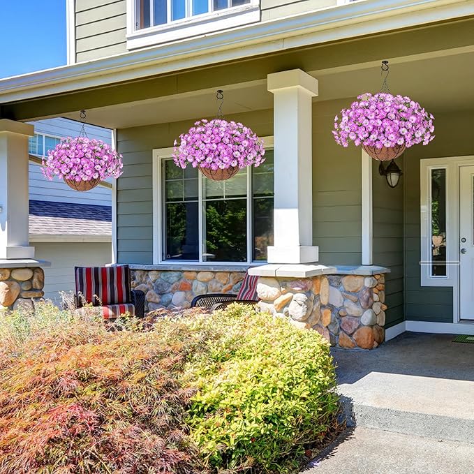 Artificial Faux Hanging Plants Flowers Basket for Outdoor Outside Spring Summer Decoration, Silk Purple Morning Glory in Planter UV Resistant Look Real Fake Flowers for Porch Patio Balcony Home Yard