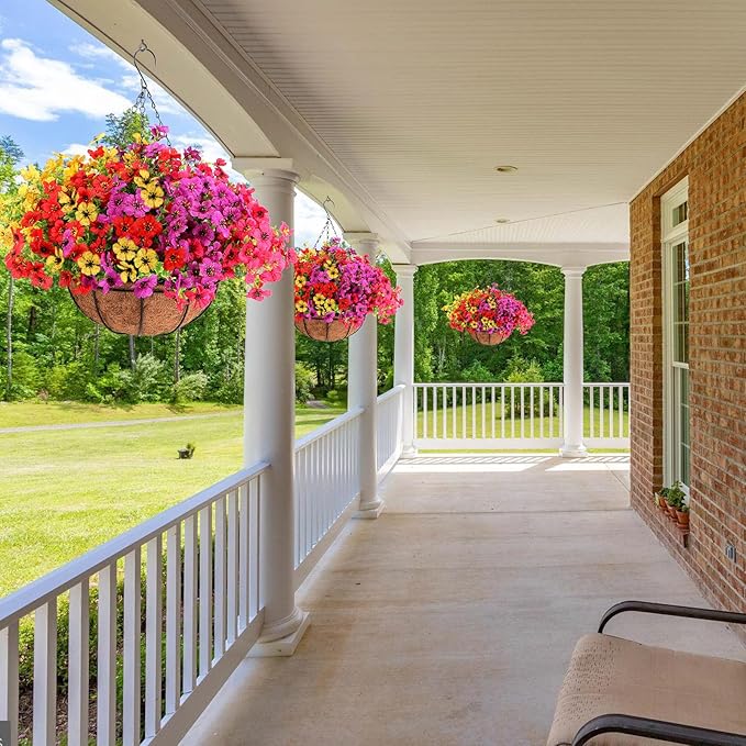Geegoods 2 Set Artificial Hanging Plants Flowers Basket for Outdoor, Fake Faux UV Sun Resistant Look Real Colorful Violet Hanging Flowers for Spring Summer Porch Home Patio Balcony Yard