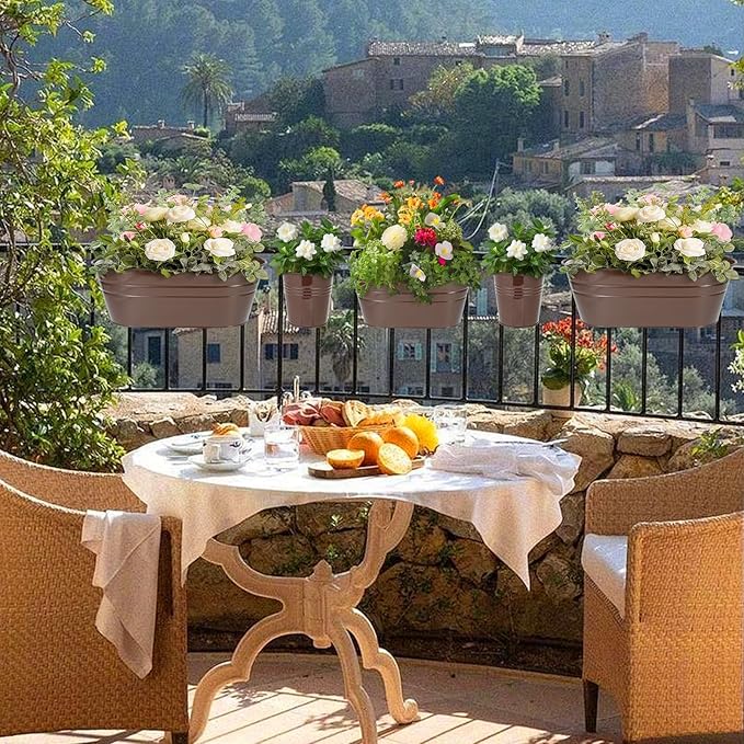 3 Different Size Metal Iron Hanging Flower Pots 13 Pcs for Outdoor Plants Metal Hanging Bucket Pots Iron Railing Fence Planter with Drainage Holes and Hooks for Porch Railing Balcony Fence (Bronze)