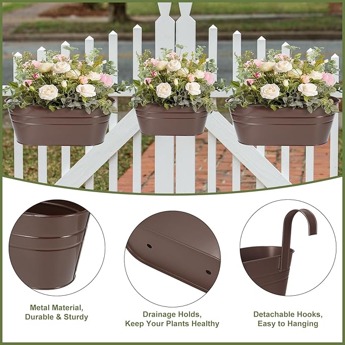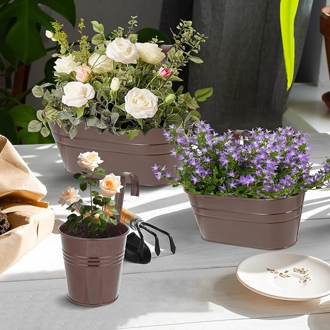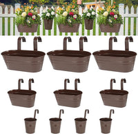 3 Different Size Metal Iron Hanging Flower Pots 10 Pcs for Outdoor Plants Metal Hanging Bucket Pots Iron Railing Fence Planter with Drainage Holes and Hooks for Porch Railing Balcony Fence (Bronze)