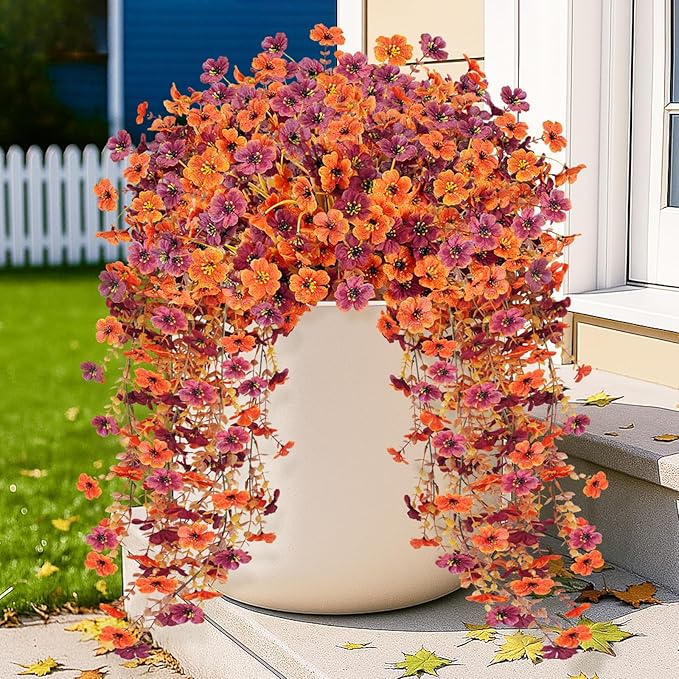2PCS Fall Artificial Hanging Flowers Plants for Outdoors, 2Pcs Faux Silk Flowers with Eucalyptus Leaves, UV Resistant Fake Fall Flowers for Autumn Home Patio Porch Outside Decor (Orange Red)