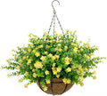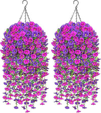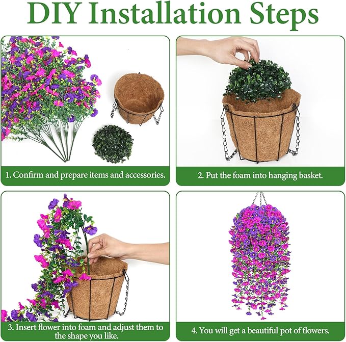 TOCHGREEN 2 Set Artificial Faux Outdoor Flowers with Hanging Basket,2 Hanging Planters Fake Silk Morning Glory Vines Eucalyptus in Planter UV Resistant for Home Front Porch Balcony Garden Yard