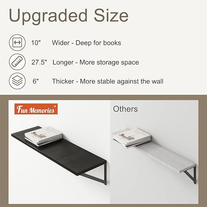 Fun Memories 27.5" W x10 D Floating Shelves, Black Wall Shelf with Brackets, 10 Inch Deep Floating Shelf Set of 2, Large Storage Kitchen Living Room Bathroom Shelves, Wood Wall Mounted Shelf Sale