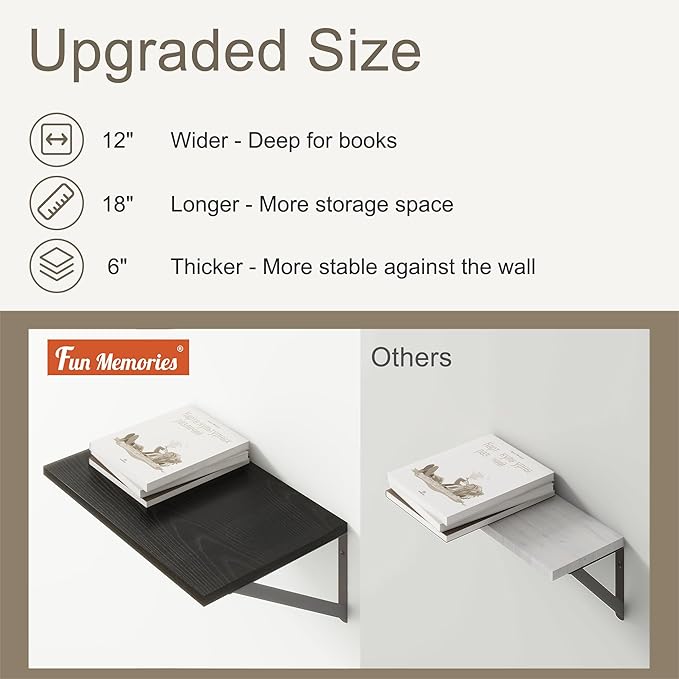 Fun Memories Black Floating Shelves 18 Inch Long, Rustic Floating Shelf with Brackets, 12 Inch Deep Wall Shelves, Black Bathroom Shelves, 18 x 12 Storage Shelf for Kitchen, Living Room, Set of 2